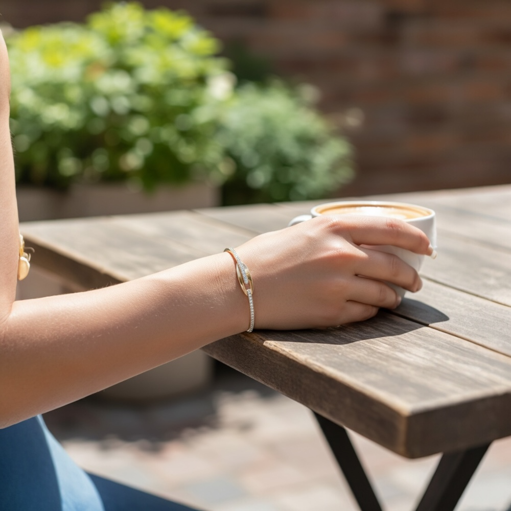Meet the Leaf Kada — a sleek, modern silver bracelet crafted in hallmarked 925 Sterling Silver with a captivating two-tone design. The front features a bold rose gold marquise leaf centrepiece framed by a slim rhodium bar set with glittering pavé cubic zirconia stones on either side. The back flows into a delicate oval-link rhodium chain, making it lightweight yet substantial on the wrist. Minimal. Architectural. Unforgettable.